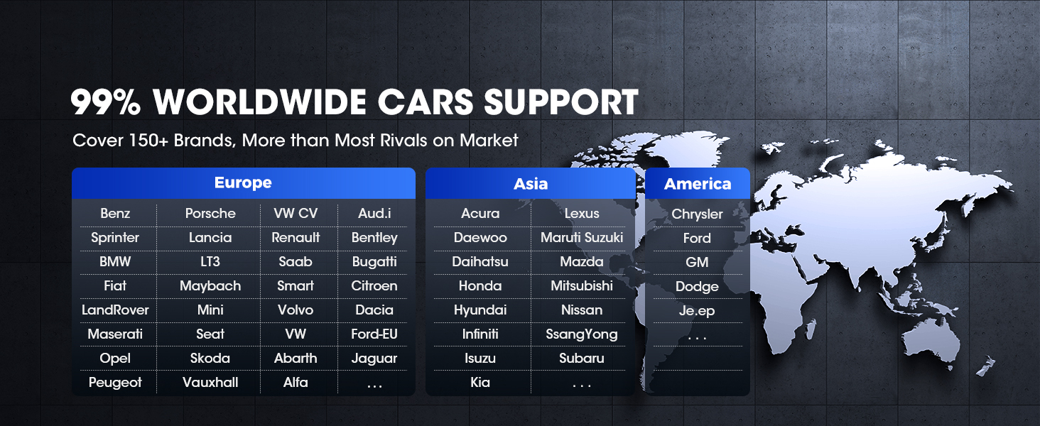 Extensive vehicle coverage for more than 80 US, Asian and European vehicle makes after 1996. Chrysler, Dodge, GM, JEEP, FORD, Abarth, Alfa, Audi, Bentley, Sprinter, Bugatti, Citroen, Dacia, Fiat, Ford(EU), Jaguar, Lamborghini, Lancia, LandRover, LT3, Maybach, MINI, Opel, Porsche, Renault, Saab, Seat, Skoda, Smart, Vauxhall, Volvo, VW CV, Toyota, Benz, BMW, VW, Peugeot, Acura, Daewoo, Honda, Hyundai, Infiniti, Isuzu, Kia, Lexus, Mazda, Mitsubishi, Nissan, Nissan GT-R, Scion, Subaru, Suzuki... Supported Protocols: