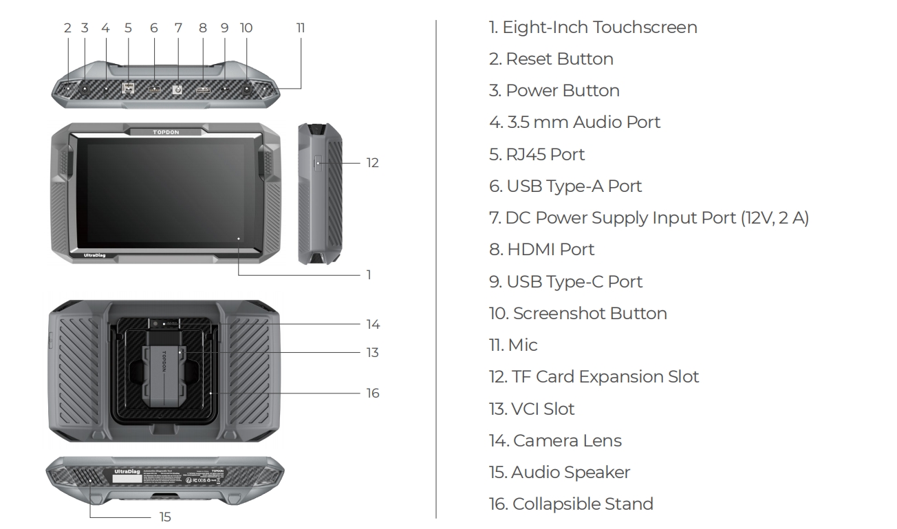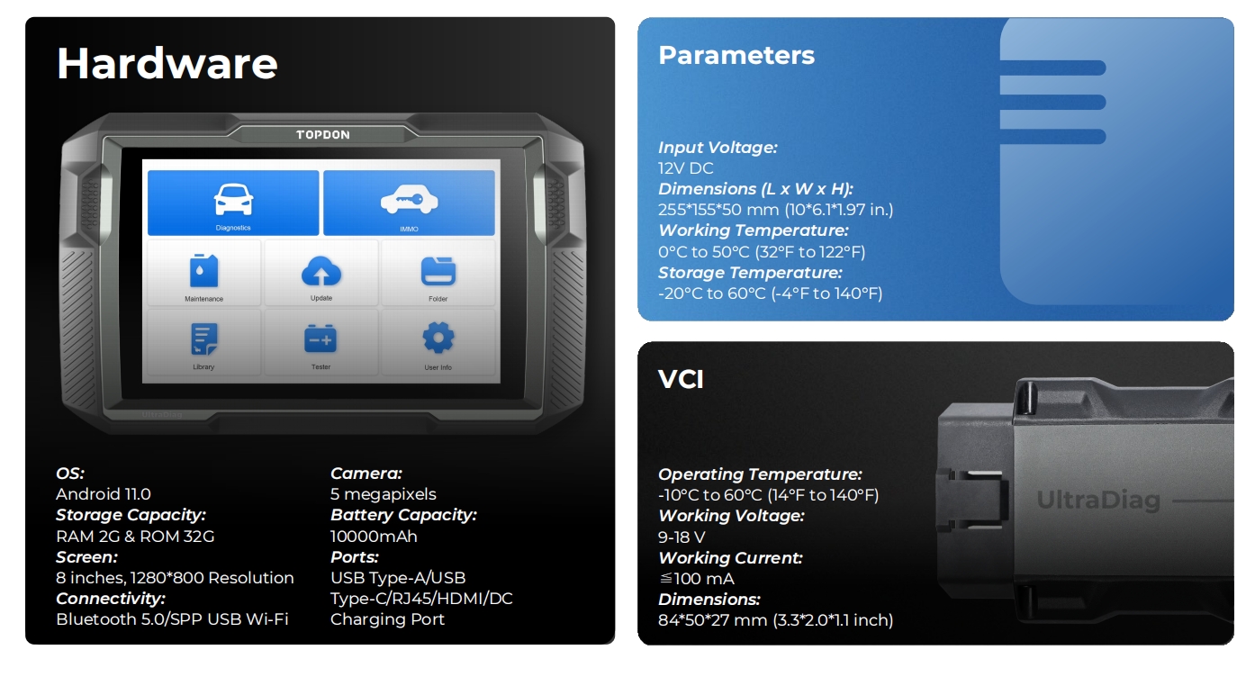 The UltraDiag features a long-lasting 10000mAh battery to save technicians from repeated recharges throughout the day. Android 11.0 makes for a fast user interface and processing. Equipped with a USB-Type A port, users can connect the VCI to the tablet for more reliable data transfers when working on immobilizer systems. The HDMI port allows users to project the diagnostic process for demonstration and analysis purposes. The TF card expansion slot supports up to 128G of storage expansion. PRODUCT OVERVIEW